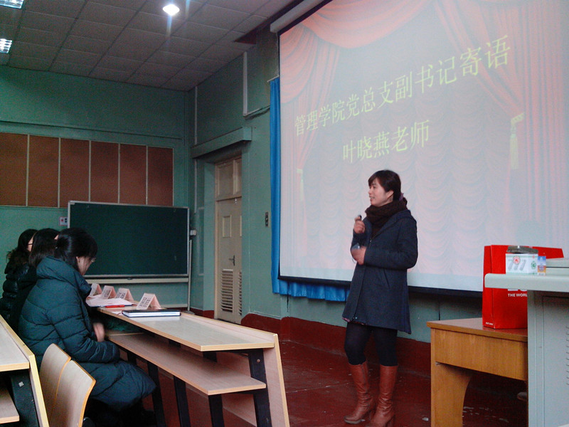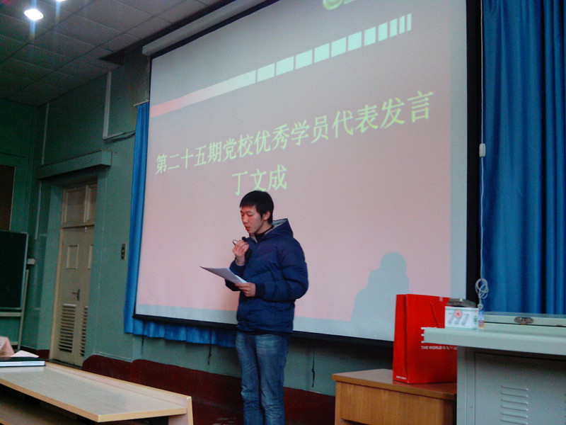 管理1203班的姚芳敏作为第26期党校学员的代表在开学典礼上发言,她代表全体积极分子向老师们做出了“按时上课、严格要求自己和主动完善自己”的保证。