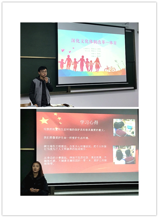 营销1501范同学还原十九大报告中所提及的文体事业改革的具体措施、取得成果及深远意义。他从东华校庆66周年和东华足球60周年出发,全面展示了对发展体育事业,养成健康生活习惯的深入思考。足球1601的同学学习了生态文明体制改革中的史上最严生态环境保护制度,运用两组图片鲜明而强烈地对比了恶劣环境的人心向背和绿水青山就是金山银山的最好例证。多位积极分子表示,在制度建设美丽中国的同时,‘保护环境,人人有责’,这最质朴的倡议表达了大家最内心的期盼。此外,积极分子们对科技、经济、外交领域兴趣也很浓厚:惊艳世界的中国高铁,以及天宫、蛟龙、大飞机等重大科技成果相继问世,城乡居民收入增速超过经济增速、扩大就业、精准脱贫等一系列经济民生成果,无一不紧扣人民日益增长的美好生活需要的核心目标。宋同学重点解析了报告中对营造清朗网络空间的论述,强调中国7.5亿网民(2017年6月行业报告数据)的巨大规模,企业需在互联网+实体经济领域深耕并坚持创新。十八大以来,以习总书记为首的主动外交策略更为中国赢得世界好评,世界发展已无法忽视中国,民族自信心和自豪感大大增强。