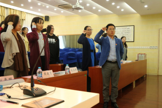 全体党员重温入党誓词,互联网+供应链研究中心党支部书记吴勇领誓。活动最后,在座11、12月的入党同志集体庆祝入党“红色生日”。