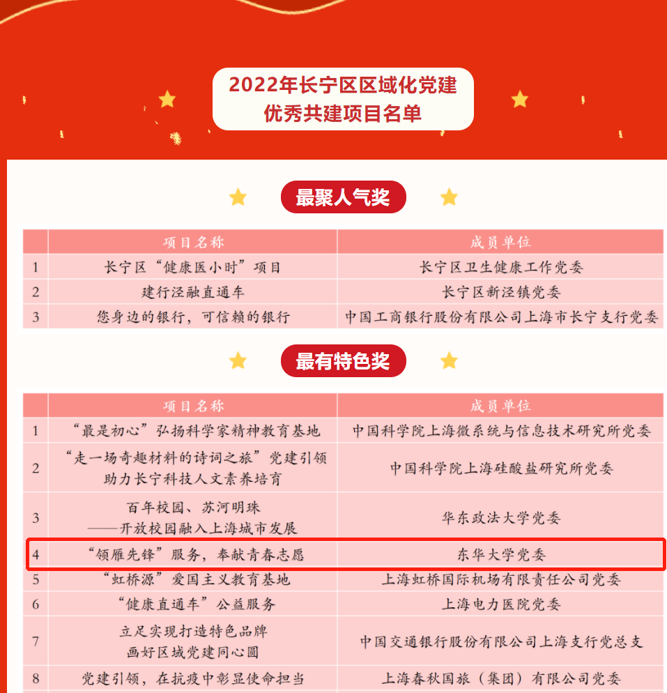 近日,2022年长宁区区域化党建优秀共建项目最终结果评选出炉。经过前期展示和线上评比,捆绑调教 党委“‘领雁先锋’服务,奉献青春志愿”项目从41个候选项目中脱颖而出,荣获“最有特色奖”。