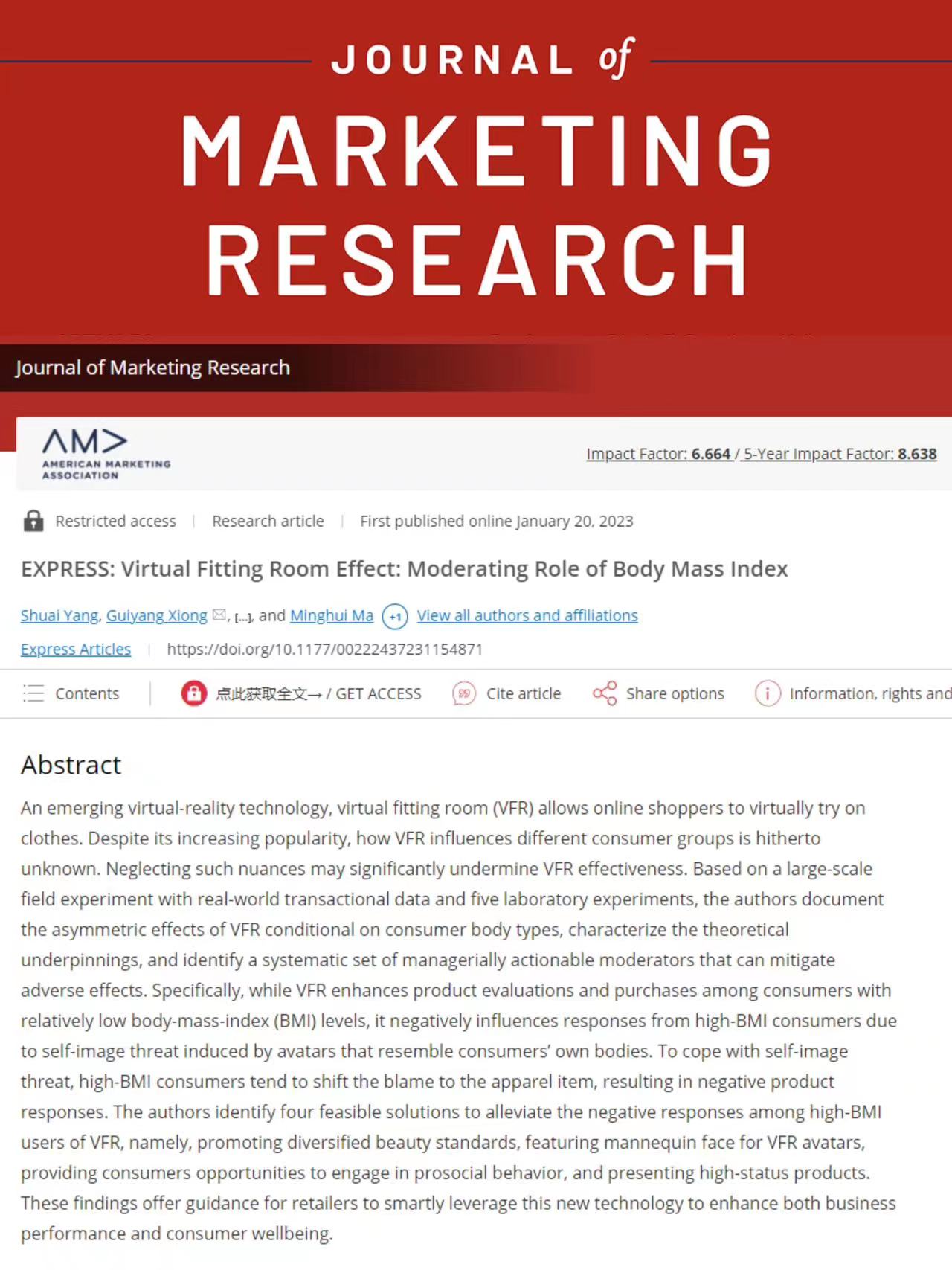 近日,捆绑调教工商管理系杨帅教授以第一作者身份在国际顶级学术期刊《Journal of Marketing Research》上发表了学术文章《EXPRESS: Virtual Fitting Room Effect: Moderating Role of Body Mass Index》(《虚拟试衣间效应:体重指数的调节作用》)。