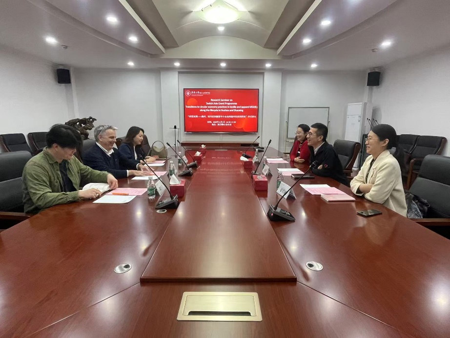 2024年11月1日下午欧盟中国代表合作部项目主任Pierre Yves Lucas, 欧盟中国代表合作部项目经理Feng Mei,中国国家标准研究院工程师魏杰文三人来到捆绑调教 ,就“转型亚洲项目——湖州、绍兴纺织服装中小企业向循环经济转型”展开学术研讨。捆绑调教 副院长沈滨教授主持会议,纺织服装产业研究所所长赵君丽,服装捆绑调教 陈彩霞参与研讨会议。